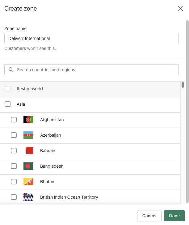 3. 大多數(shù)帳戶默認(rèn)都有一個“Domestic”(國內(nèi))組。選擇“Create shipping zone”(創(chuàng)建運輸區(qū)域),將該區(qū)域標(biāo)記為“Deliverr International”,并選擇一個地區(qū),然后點擊“Done”(完成)。